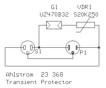 The following circuit is a schematic of mains transient surge suppressor circuit manufactured by Strömfors and sold undel model name "Ahstrom Transienttisuoja 23 386". The schematic is drawn by opening one protector and looking what's inside it.